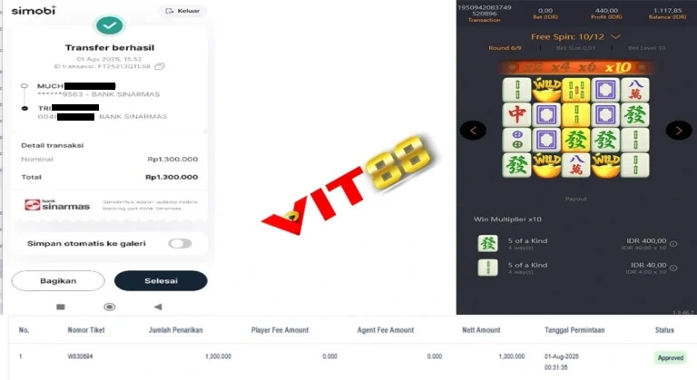 Gampang banget! Main aja di VIT88, pilih game favoritmu seperti Mahjong Ways, Gates of Olympus, atau Sweet Bonanza, lalu nikmati setiap spin. Kalau hoki, tinggal klik WD, dan… jreng! — bukti transfer bakal nongol di halaman kemenangan kamu.